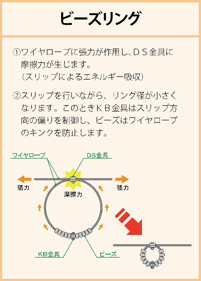 支持ロープ、ビーズリング、KT装置のトリプル緩衝機構により、最大2100kJの落石エネルギーに対応可能です。