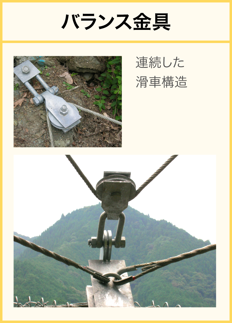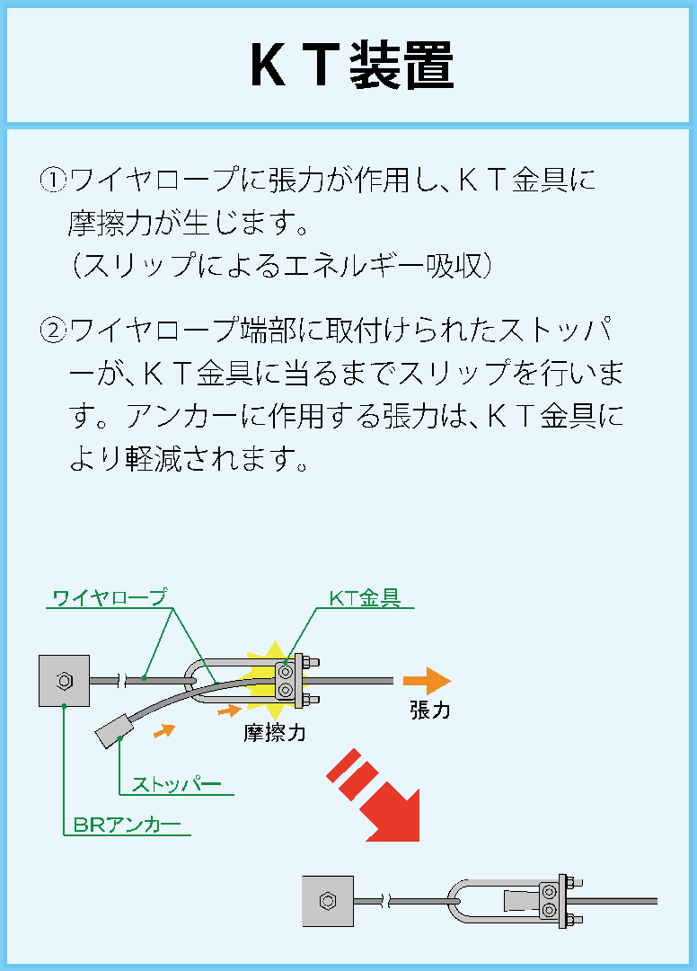 - 支持ロープの滑車構造による荷重の分散と緩衝機構により、アンカーや地盤、ワイヤロープへの負担が軽減できます。