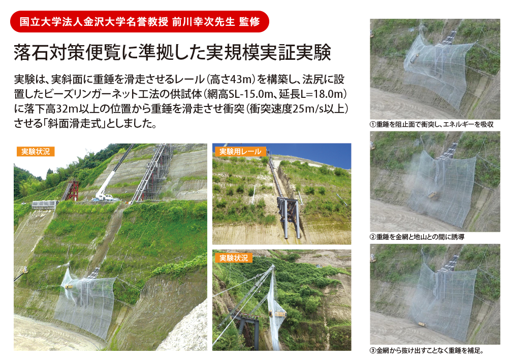 「落石対策便覧」記載の「実験による性能検証法」に準拠した実規模実証実験を行い、落石防護性能を検証しています。