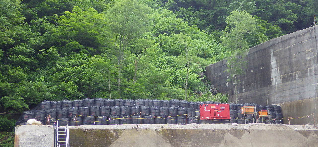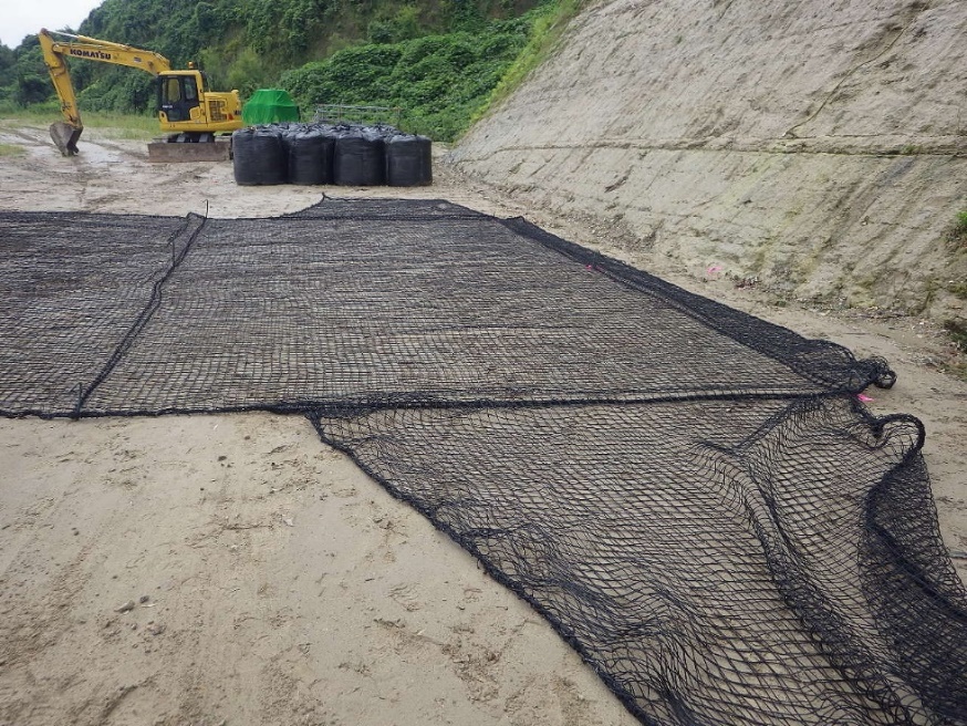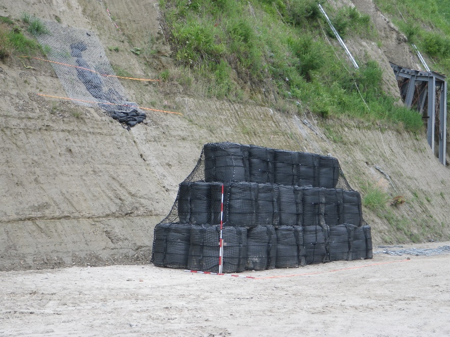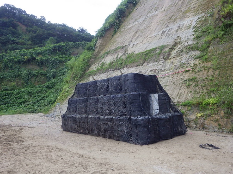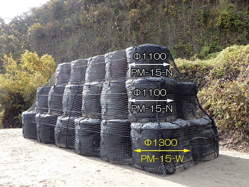 パワーモンスターは、大型土のうを多段に積層し、繊維ロープと繊維ネットを用いて一体化した構造体で落石や崩壊土砂から保全対象物を防護する落石・崩壊土砂防護大型土のう擁壁です。構造体を一体化することで構造全体でエネルギーを分散させ、吸収する効果があり、さらに大型土のう間に発泡スチロールブロックを配置することで最大2,400kJまでの落石に対応できます。施工は大型土のうを積層し、ロープとネットで固定する簡単な施工であるため施工性に優れています。また、落石・崩壊土砂の防護性能は実規模実証実験により確認しているため、信頼性が高い工法です。