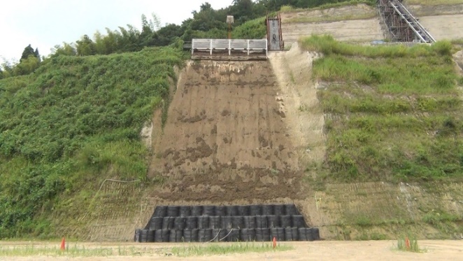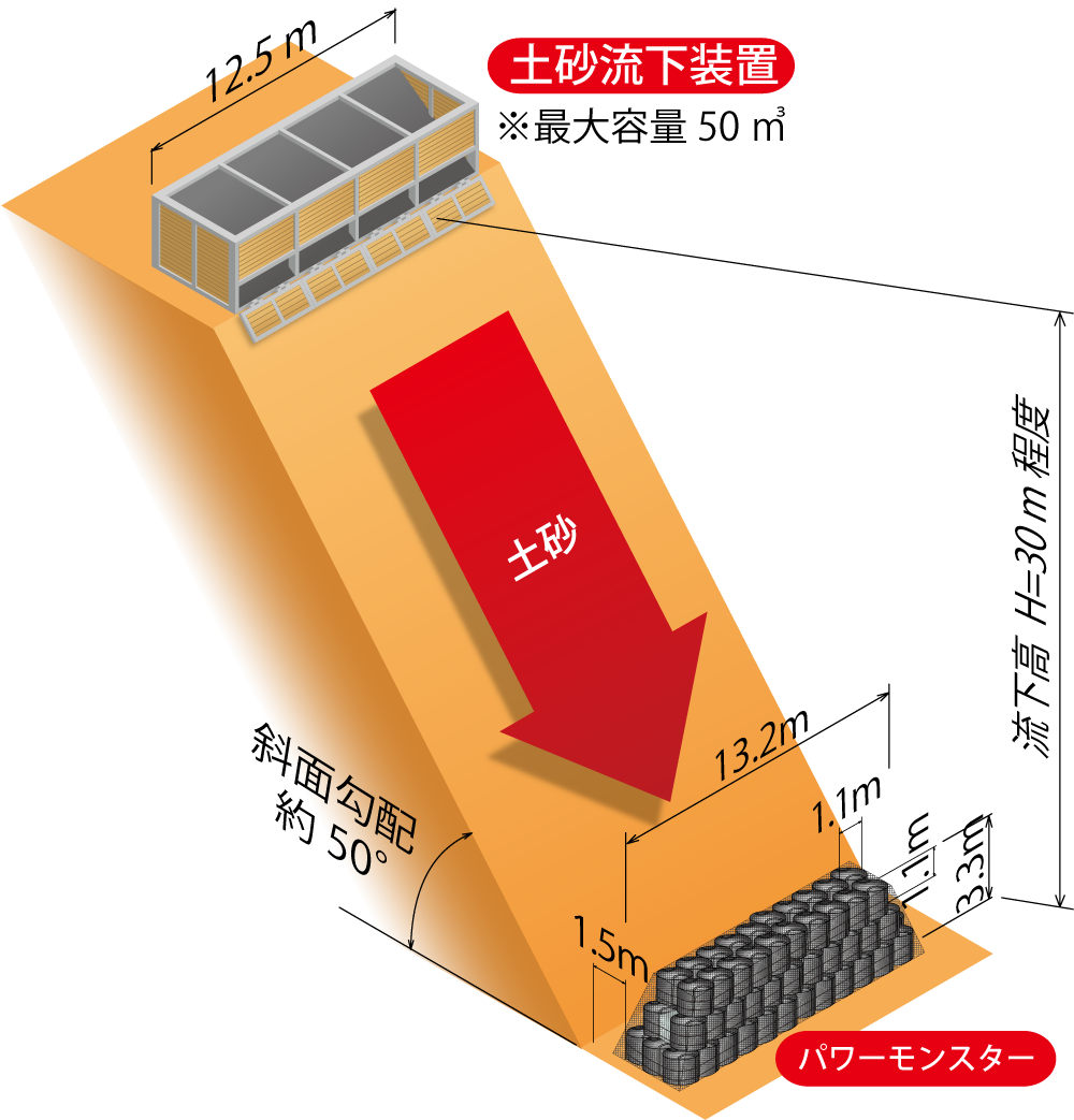 斜面高30mの斜面天端に土砂流下装置を設置し、50m3の土砂を流下させ、供試体に衝突させました。実験は各タイプとも連続で2回(50m3/回×2回=100m3)土砂を衝突させました。各TYPEとも連続2回の土砂を衝突させましたが、供試体の大きな損傷や転倒することなく土砂を捕捉しました。付与した土砂衝撃力は、TYPE-Mで128.5kN/m2、TYPE-Lで136.6kN/m2でした。最終的に供試体背面に土砂を満載させましたが、転倒はなく、静止状態を確保しており、堆積土圧に対する耐力も確認できました。タイプ毎の実構造における土砂衝撃力や堆積土圧に対する崩壊土砂防護性能を検証することができました。