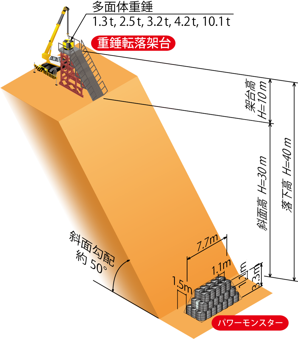 落石対策便覧記載の実験による性能検証法に準拠した実規模(壁高3.3m、延長最大7.8m)の供試体を構築し、所定のエネルギーとなるような重錘を斜面から転落させ、供試体に衝突させました。実験は、TYPE-M(3ケース)、TYPE-L(6ケース)を行い、全ケースにおいて、繊維ネットや繊維ロープの一体化効果が確認され、供試体の倒壊や貫通することなく重錘を捕捉しました。TYPE-Mは最大1058.7kJの衝突エネルギーを捕捉、TYPE-Lは最大2467.9kJを捕捉しました。タイプ毎の実構造における適用範囲の確認と落石防護性能を検証することができました。